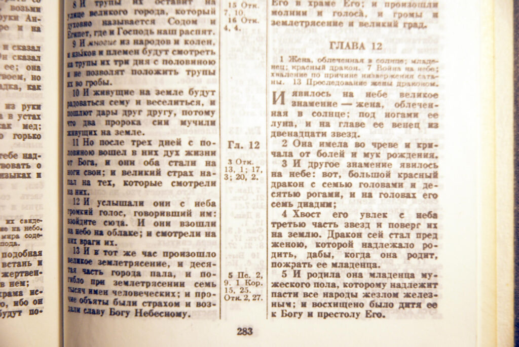 1 И явилось на небе великое знамение: жена, облеченная в солнце; под ногами ее луна, и на главе ее венец из двенадцати звезд.